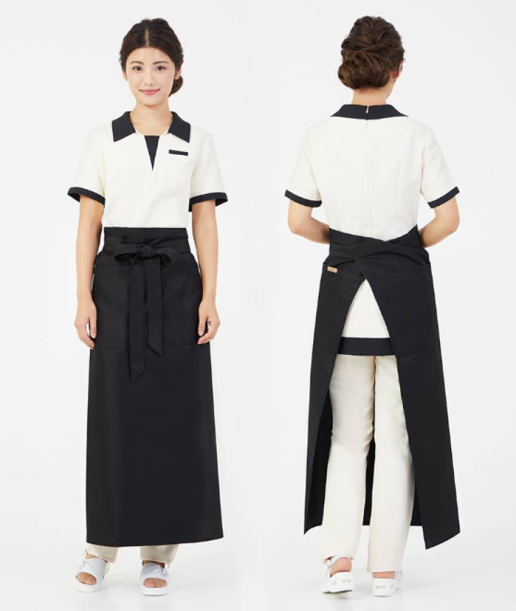 スタイリッシュなシルエットが格好良くスタイルアップしてくれるロング丈エプロン フロントと両サイド2つのポケットがあり収納力も抜群