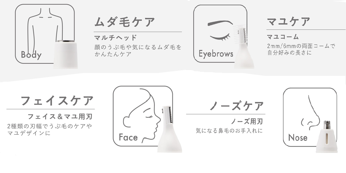 気になるときに1台4役ケア! 4種のアタッチメントで隅々まできれいにできる! スティック型で持ちやすい マルチヘッドで顔や首、襟足、手と腕のムダ毛ケア フェイス…